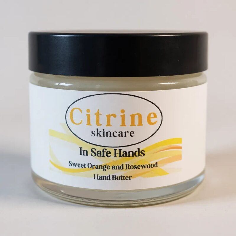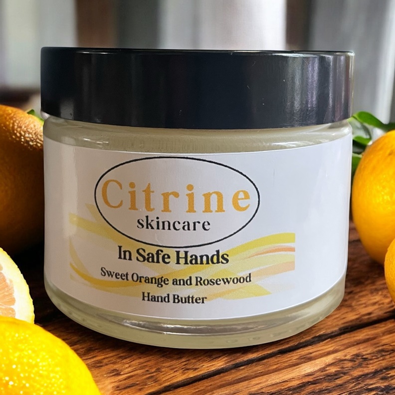 In Safe Hands Butter is an ultra-rich hand butter crafted to deeply nourish and protect. Made with a luxurious blend of shea, cocoa, and mango butters, plus coconut, jojoba, and sweet almond oils, it melts into your skin for intense hydration. Safflower oil and Vitamin E provide extra conditioning and antioxidant protection, while rosewood and sweet orange oils add a gentle, uplifting scent. Perfect for soft, healthy hands every day!